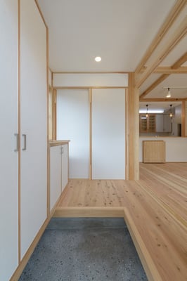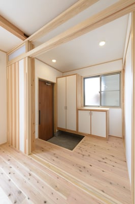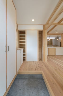 玄関ホールとリビングは建具を引き込むことで一体となります。
