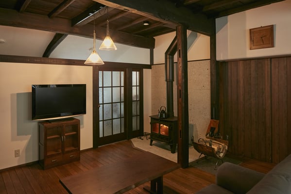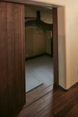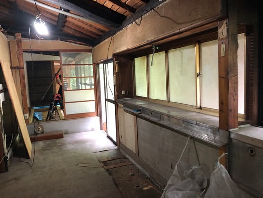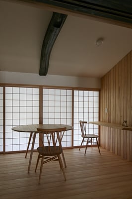 昭和に改装された内装を剥がすと煤に燻されたしっくい壁に柱梁、今回はそれを現わしにして内装を整え、リビングダイニングキッチンとしました。