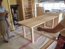 ダイニングテーブルが出来たので仮置きしてサイズ合わせ いつも少し大きめ少し高めに作ることにしています。 仮置きしてサイズ調整 オーダーですからね。 両サイドが桧で中板に杉の赤を使います。 面白くないので一枚板は使いません。 外では登り棟の修復、瓦は昭和8年のものをそのまま 板金屋さんはノシ瓦の上の水切りをチョキチョキ...