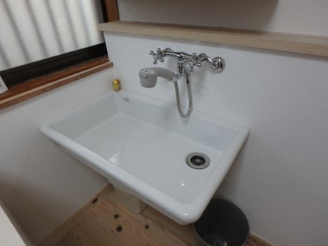 鴻巣市松原の家リノベーションほぼ完了 totoの陶器シンクをブラケットで取り付け シャワー付きの2ハンドル水栓はカクダイ これは建て主さん支給品を取り付けました。 大きなボウルなのでシャワー水栓は便利、洗面周りは今後モザイクタイルをセルフする予定で、現状はシックイで仕上げてあります。