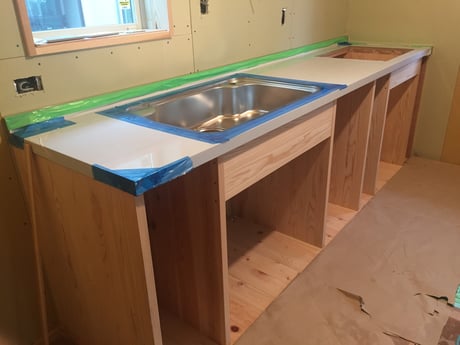 シンプルキチン 造作キッチン進行中 今日も雨でしたね。 今日は午後から川島町 北園部の家打ち合わせから同じ町内の八幡お家現場確認 キッチンの造作中でした。 八幡の家