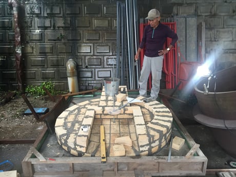 かまどづくり始まりました。 ときがわ町旧給食センターをリノベーションで和紙工房へ変身 先が長いお話しになりそうです。 かまどは楮を煮る薪がまです。 釜の直径で1.2m 3人ぐらいなら十分入れます。 写真は焚き口の下ができた段階でまだまだこれからです。 手漉き和紙たにの