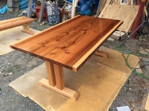 テーブルの造作 素材は杉かなりの年輪 100年か15年か ときがわの倉庫で眠っていた。 脚は足が当たらないようにしたいとのリクエストから中に送り込んで2本立て