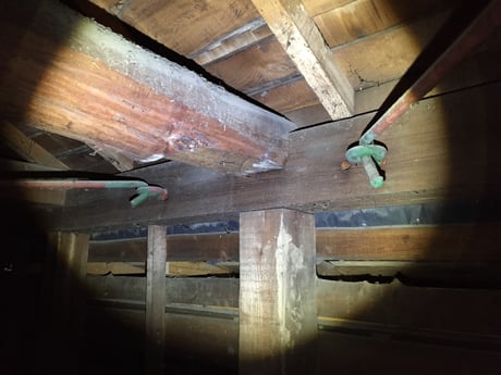 各部屋単位で丸鋼水平ブレスがとられていました。 このような細工は初めてみました。 小屋材には丸太を多用しているので火打ち梁が入れ難かったという事情もあるかもしれません。