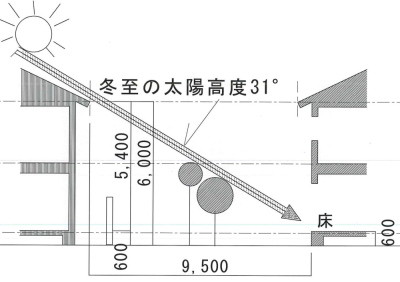 理想論かもしれませんが、埼玉に暮らす時、南に普通の2階建てが建っている場合、 その建物から約10m離れれば、冬至の日が一年で一番太陽高度が低いときでも1階の南窓際の床まで日が入ります。(冬至の太陽角は約31°)