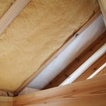 3枚目は天井にウッドファイバーを入れたところです。白いところはまだ入れていないところで、垂木が90mm有り、ウッドファイバ―も90mm有ります。