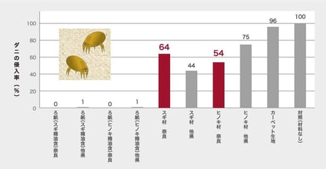 杉材や桧材に侵入したダニはカーペットの1/2~2/3