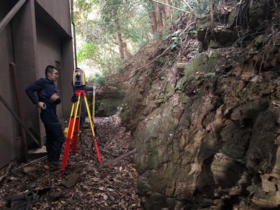 平らな土地と比べてこのような土地は正確に高さをとらないといけません、崖の角度や高さから建物を離さなければいけない距離や、崖崩れに対処する方法などを検討するためです。
