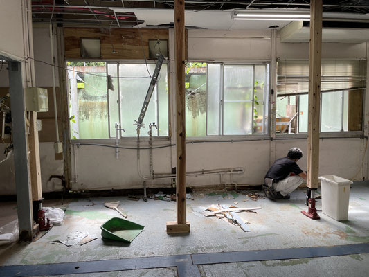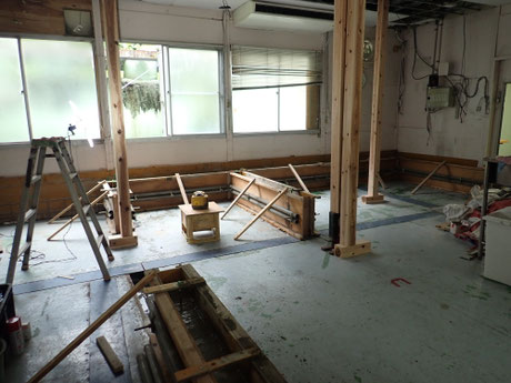 改修方法としては慎重に複数のジャッキで均等に上げていき、水平を維持してところで脚部の補強を行い、固めていきます。