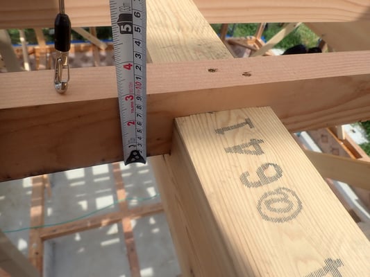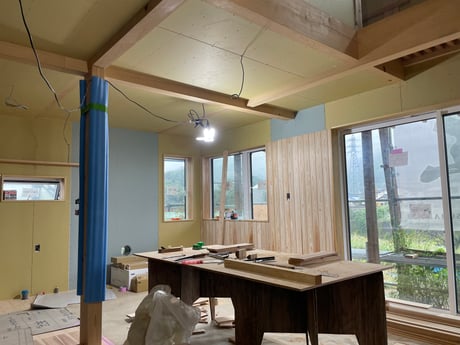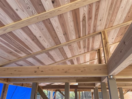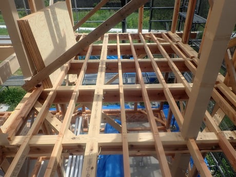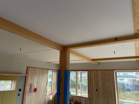 理由は上棟時に天井工事を終わらせてしまうこと、210mmの梁を910mm間隔に入れ、天井板を上棟後すぐに落とし込み、屋根断熱まで先に終わらせてしまいます。