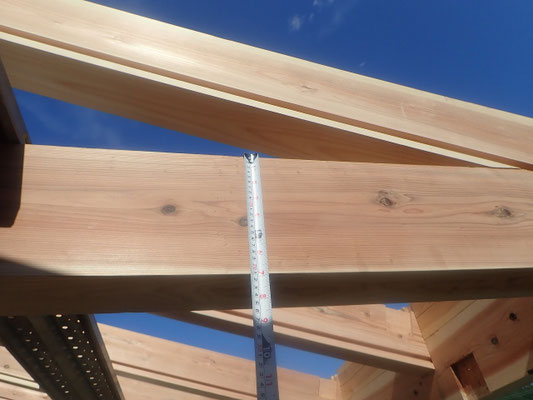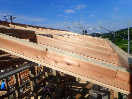 根太の上に20mmの杉の荒床(仕上げていない荒っぽい幅広の杉板)を張り込み水平剛性を確保しますが、構造用合板ほどには強度は上がりません。