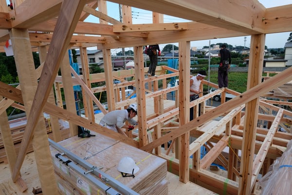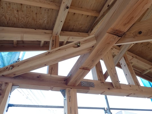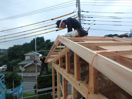 外来の工法2×4などでは床を先行しますが雨が多い日本では屋根を先に施行し、構造材を雨から守りながら施工するのが古来からの工法です。