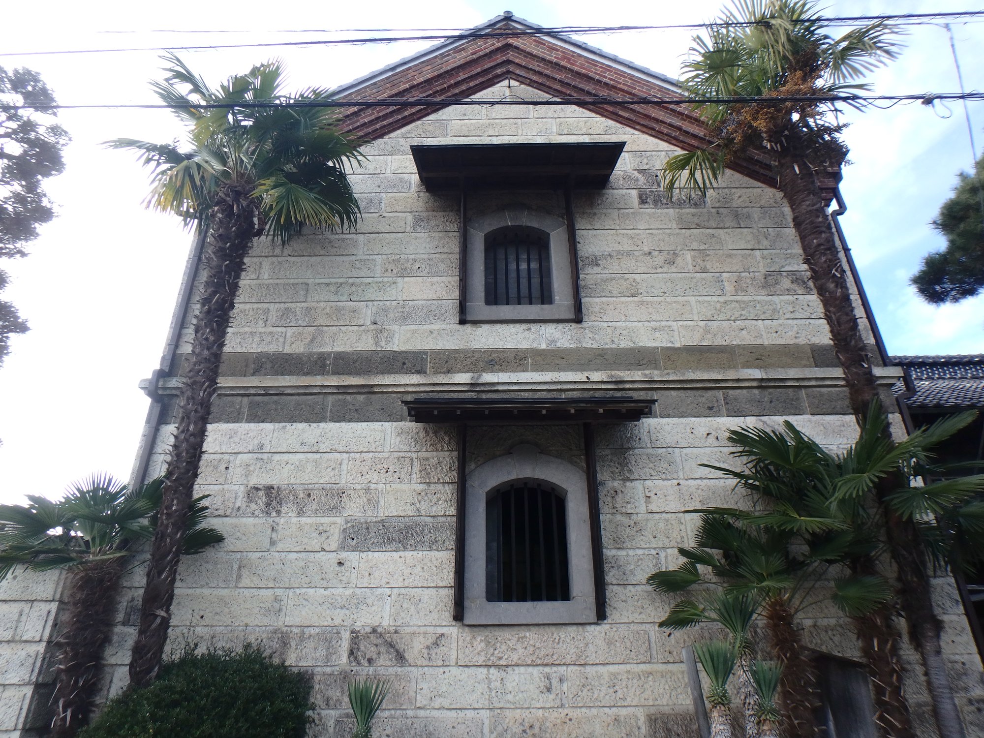 おしゃれな蔵を見つけましたよ。 屋根周りはレンガですよ。 胴差回りは石を替えてますね。 窓周りもアーチでおしゃれですよ。 大谷石のようなじゃないようなもっときめが細かい石です。 戦前の蔵みたいです。 ヤシの木?が似合いますね。