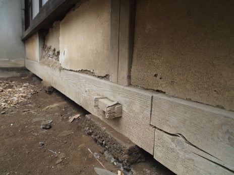 基礎廻りの漆喰は、下地を修理して泥を塗り直します。