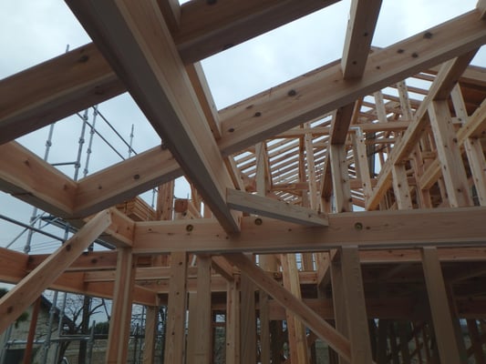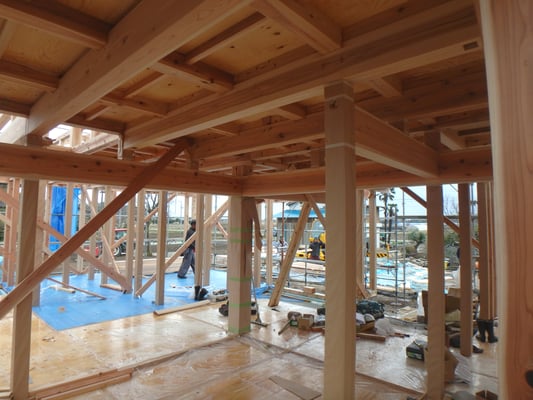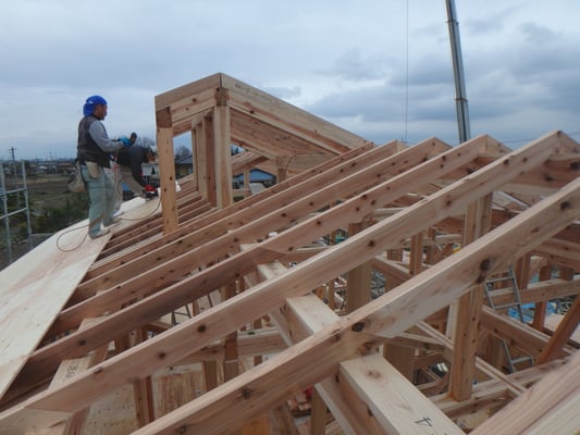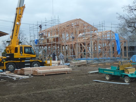 川島町北園部の家 2世帯3世代同居の家です。ここまでほぼ1年かかりました。天気がいまいちですが二日がかりで上棟となりました。