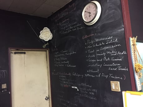 ワイン醸造コンサルタントの増子さん。趣味がワイン文献収集と翻訳というその蔵書も素晴らしい。 製造現場というより研究所のような事務所、壁全部黒板塗料がいい、文字が綺麗な方がうらやましいな~