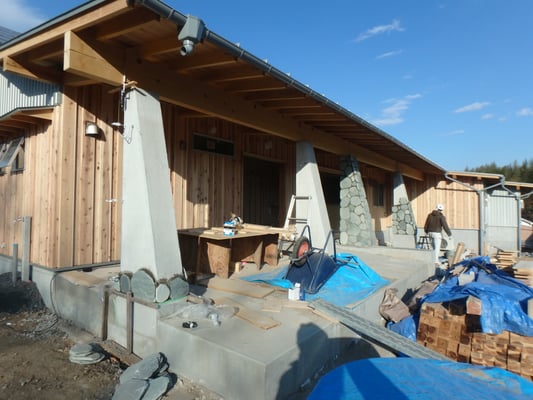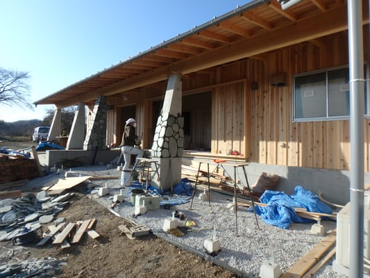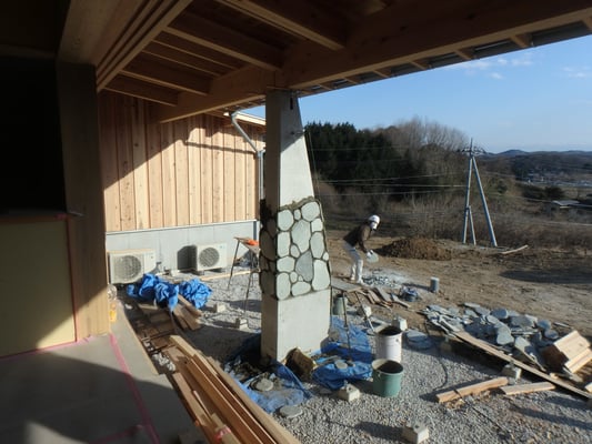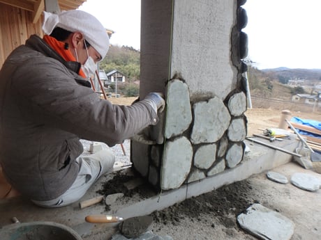 ワイナリーの試飲コーナのテラス柱石貼りしてます。