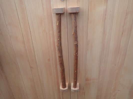 桧の柿渋塗りに赤松の枝丸太の取手です。